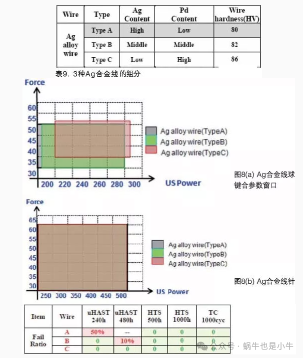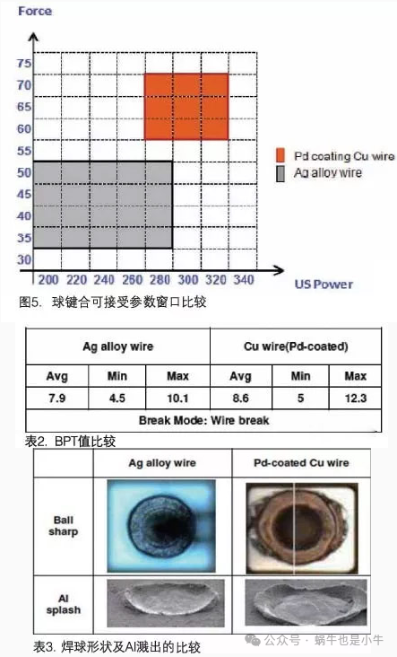 ●键合参数 (图5): Cu线需要显著更高的超声功率 (US Power) 和键合力 (Force)。Ag合金线的可接受参数窗口更大。