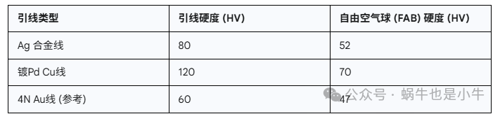●结论: Cu线的FAB硬度最高,比4N金线高约50%。Ag合金线的FAB硬度仅比4N金线高约10%。这预示着Ag合金线在减少焊盘损伤方面可能更有优势。